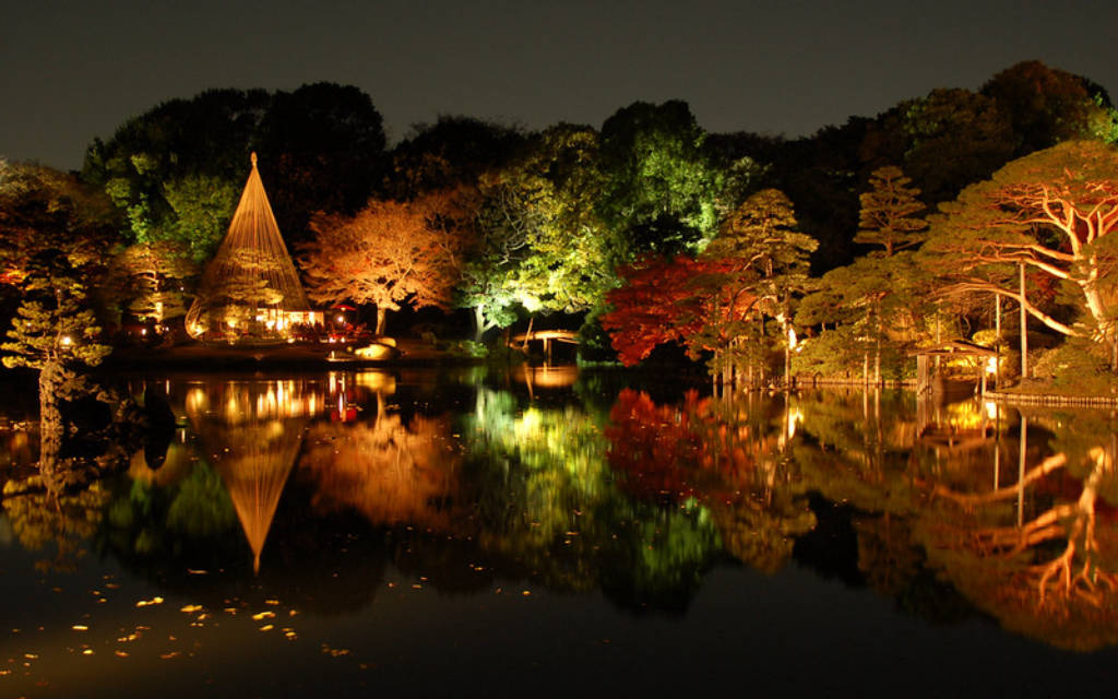 19:00 - Rikugien Garden , a traditional Japanese landscape garden with beautiful autumn foliage. In the fall, it's open until 9 p.m., with last entry at 8:30 p.m., coinciding with evening illuminations. Be aware that it can get crowded after work, but it's also one of the few places in Tokyo to see autumn colors at night, with the red foliage reflecting off the beautiful shimmering lake.