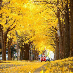 09:00 - Yoyogi Park . The south side of the park that runs between Yoyogi-Koen Station and Harajuku Station has the most beautiful fall foliage, with numerous vibrant yellow ginkgo trees and scarlet maple trees.