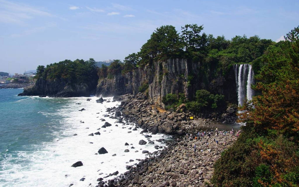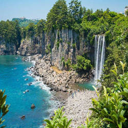 Jeongbang Waterfall is one of the top three beautiful waterfalls on Jeju Island. With a height of 23m, two waterfalls flowing down steep black cliffs and ancient trees hanging down from both sides create a romantic scene that attracts many visitors.