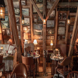 Inside, tables and chairs take over what used to be an old attic beneath the hotel's dome. Continuing the spirit of a minimalist and respectful innovation, Philippe Starck sought to enhance existing structural elements. The monumental frame is superbly highlighted, with the original brick walls and wooden floors once again on display. The furniture here also seems to have always remained in the imaginary office of this harbor room: with light leather upholstered in vintage floral fabrics, and rugs picked up on trips to Persia and Europe ASIAN. In the pigeon coop, stained-glass windows created by Ara Starck accompany and direct sunlight through the dome. Like a multifaceted story, these stained glass windows tell many different stories throughout the day, giving diners a magical and unique experience.