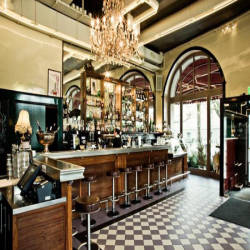 Open since 1910, the bar at the Volkshaus gives guests a 90s feel of elegant classics with its gorgeous crystal chandeliers, dark wood bar and stone countertops. granite, porcelain and dark wood floors, wooden tables and chairs, and round leather chairs line the bar.