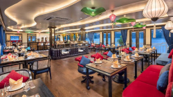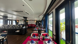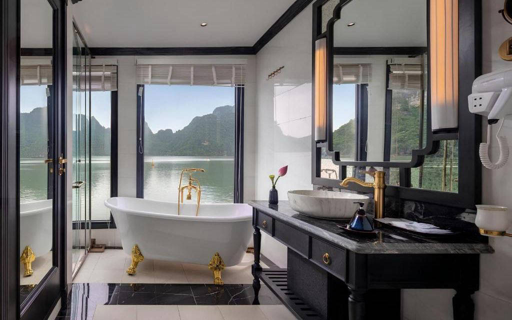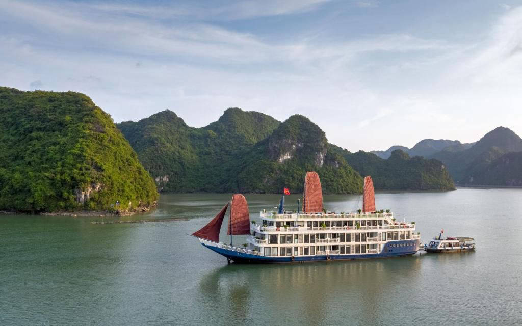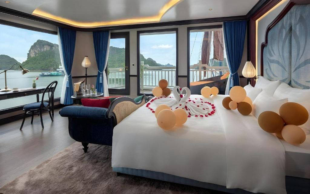 Du thuyền có 18 cabin rộng rãi, nội thất gỗ tự nhiên, ban công riêng hướng vịnh, nhà hàng và quầy bar với tầm nhìn toàn cảnh. Hành trình 2 ngày 1 đêm đưa du khách khám phá khu vực yên tĩnh, ít tàu du lịch, tham gia chèo kayak và bơi lội tại Ao Ếch, tham quan Hang Sáng – Hang Tối bằng thuyền nan.