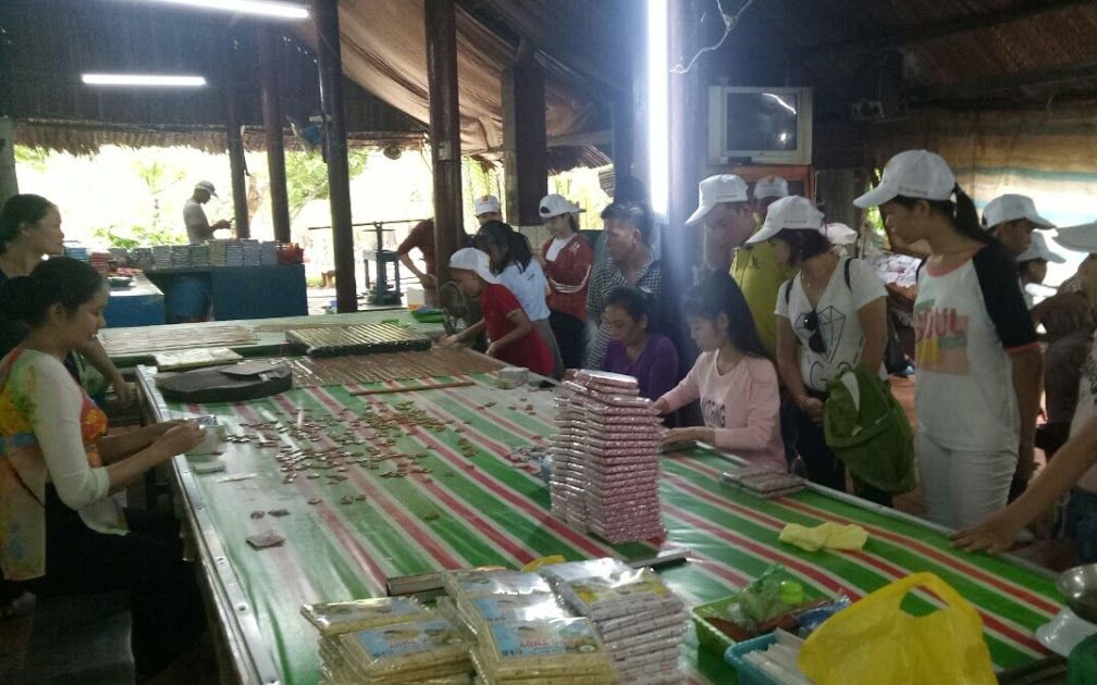Entering Ben Tre province — “the land of coconuts.” Here you’ll see a typical agricultural model called “Garden – Pond – Cage,” before visiting the coconut candy-making shop.