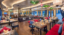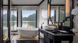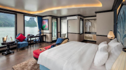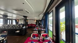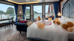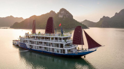The cruise ship features 18 spacious cabins with natural wood interiors, private balconies overlooking the bay, and a restaurant and bar with panoramic views. The 2-day, 1-night itinerary takes guests to explore a tranquil area with few tourist boats, participate in kayaking and swimming at Frog Pond, and visit Bright Cave and Dark Cave by traditional bamboo boat.