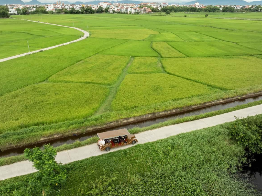 Pass through the rice fields of Vong Nhi village, an area that reflects the traditional agricultural landscape of the region.