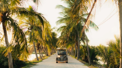 Travel along Coconut Road, a picturesque rural route shaded by rows of coconut trees.