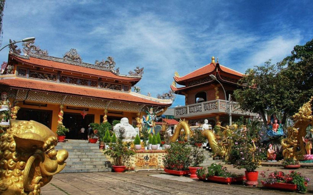 Bước vào khuôn viên, du khách sẽ ấn tượng với bảo tháp 5 tầng, quả chuông U Minh nặng hơn 135kg và tượng Quan Thế Âm Bồ Tát đặt trên lưng rồng dài uốn lượn. Mỗi chi tiết đều thể hiện bàn tay khéo léo của nghệ nhân và sự trang nghiêm trong đời sống Phật giáo.