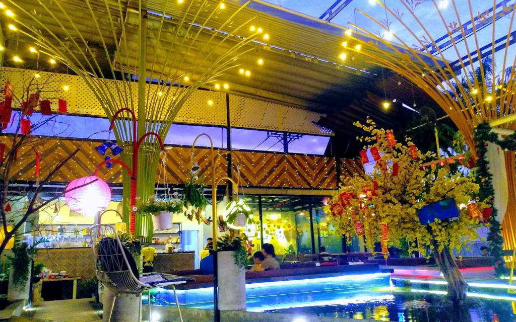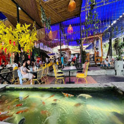 Để có những bức ảnh "thơ" và lạ, bạn nên chọn ngồi ở khu vực tầng lầu để lấy toàn cảnh hồ cá từ trên cao, hoặc chọn các vị trí bàn tròn giữa hồ lúc sáng sớm khi nắng vừa lên. Buổi tối quán lên đèn led lung linh phản chiếu xuống mặt nước cũng rất huyền ảo. Nếu đi cùng gia đình có trẻ nhỏ, đây chắc chắn là thiên đường vì các bé sẽ rất thích thú khi được tận tay cho cá ăn.