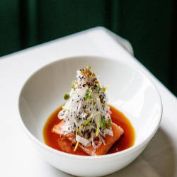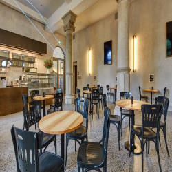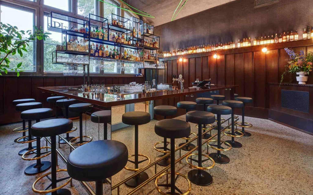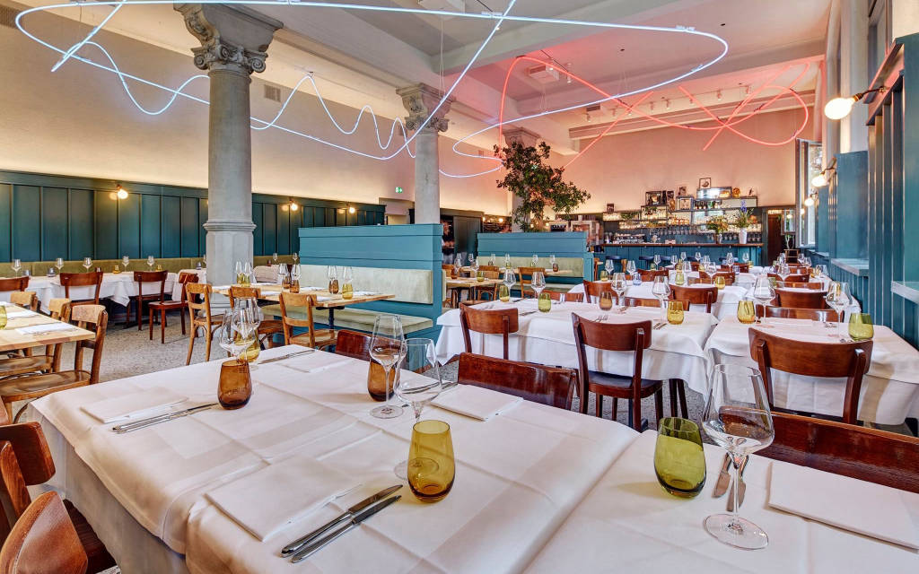 Những ống neon mỏng uốn lượn quanh những cột đá đồ sộ và tinh tế chiếu sáng trần nhà cao. Các tấm gỗ màu xanh đậm và sàn terrazzo mang đến cho căn phòng một sự sang trọng nhất định. Ngay cả trước khi nhà bếp phục vụ món đầu tiên, nhà hàng trong Bảo tàng Zürich đã gây ấn tượng với sự pha trộn thành công giữa hiện đại và cổ điển trong bầu không khí thoải mái.