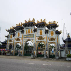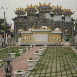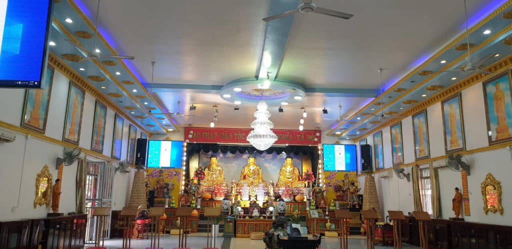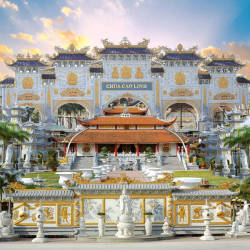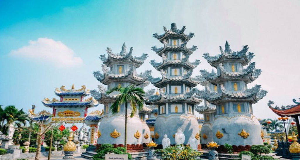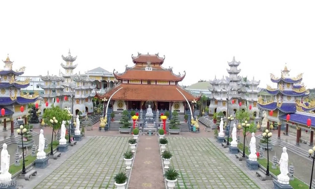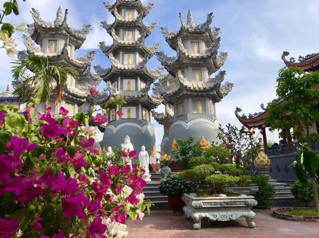 Điểm ấn tượng đầu tiên đối với du khách khi đến chùa đó là cổng ngũ hành khổng lồ, mỗi cổng được xây dựng khá giống nhau, riêng chỉ có cổng chính đặt chính giữa to hơn và nổi bật bức tượng phật màu vàng tỏa ánh hào quang trên nền đá trắng. Từ cổng, bạn sẽ bắt gặp bức tường bình phong phía trước có thờ tượng Quan Thế Âm như đang nhắc nhở du khách đến chùa luôn mở lòng từ bi bắc ái. Tiếp đến là khu vực sân chùa nổi bật hai bên sân là hàng tượng phật A Di Đà màu trắng mỗi bên 7 pho tượng, chính giữa là thảm cỏ màu xanh dẫn tới Ngôi Đại Hùng Bảo Điện cũng là điểm thờ chính ở chùa, nơi mọi người đến thắp hương cầu bình an.