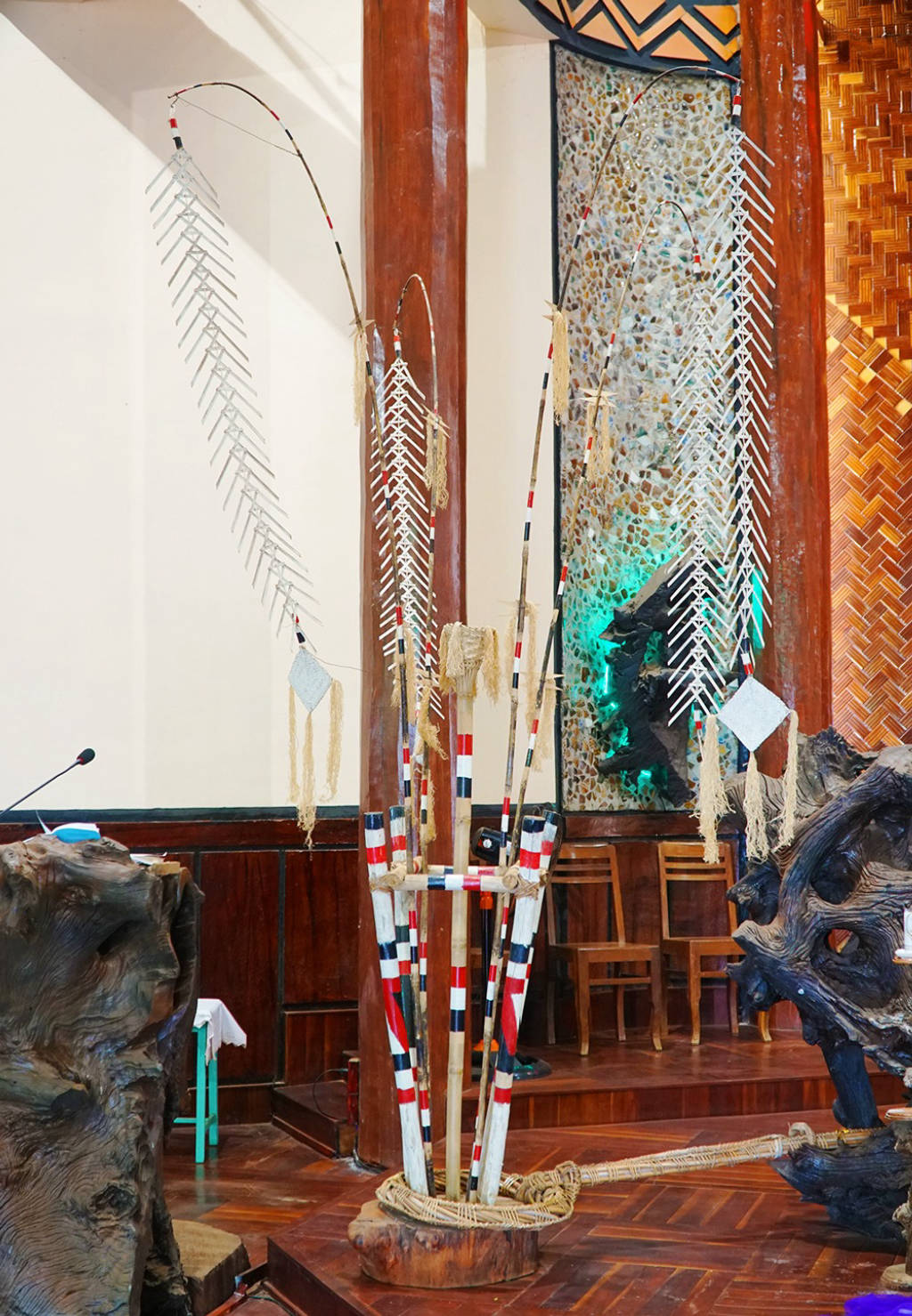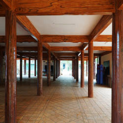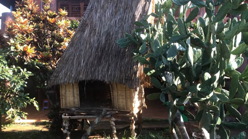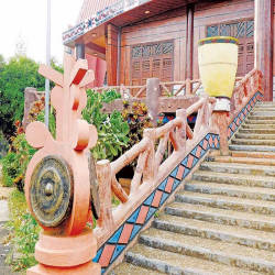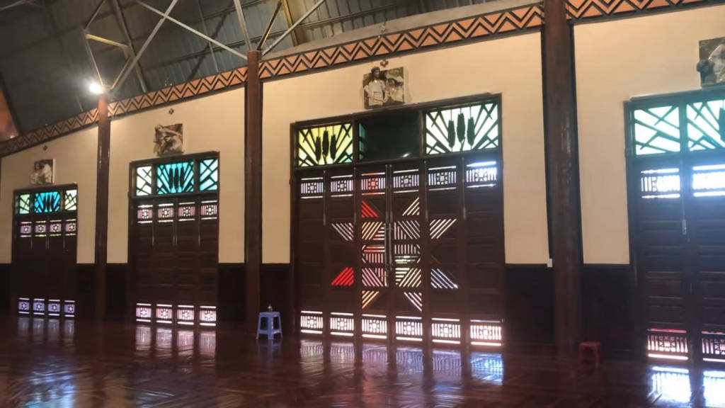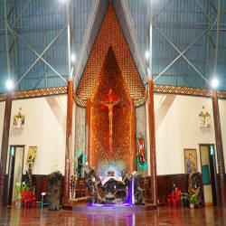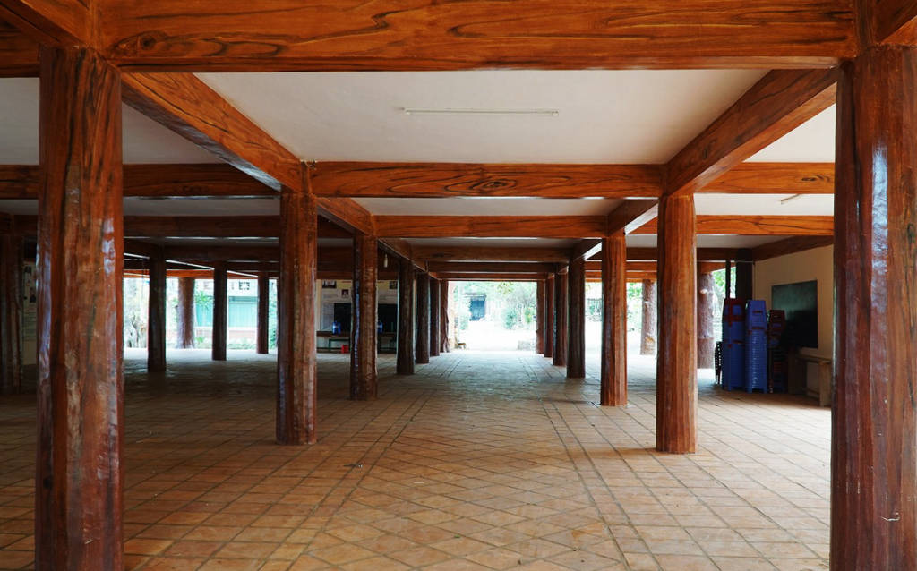 The architecture of this church has special features in appearance and decoration according to the culture of the Jrai people. Pleichuet Church has a large size, three or four times that of a normal house, built on big wooden pillars, about 2m above the ground. The roof of the church is covered with corrugated iron, the roof is red, the roof top is designed as sharp as an arrow piercing the sky. The pillars, doors, floors or other decorative details in the church are built based on wood as the main material. The space of the church is very spacious with the veranda and the main hall. Prominent in the middle of the main hall is the altar area with the statue of Christ the Redeemer on the cross carved with meticulous and elaborate wood. Below the altar area, visitors will not see the familiar benches or kneeling tables, but instead a wide wooden floor. In front of the statue of God, there are many symbolic decorative details, the most prominent of which is the image of a miniature tree. Besides, the patterns and motifs typical for the culture of the Jrai people appear in almost every space inside the church, from the doorways, walls, ceilings to the central space of the church. Located next to Pleichuet church is the monastery of the fathers, which is easily accessible during the day because it is open continuously.