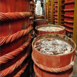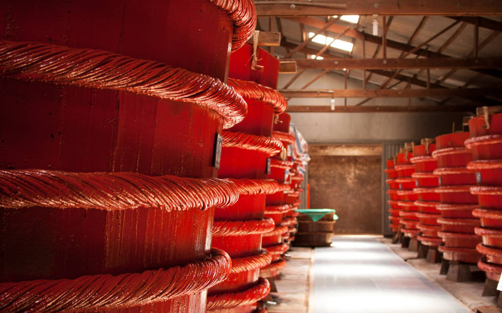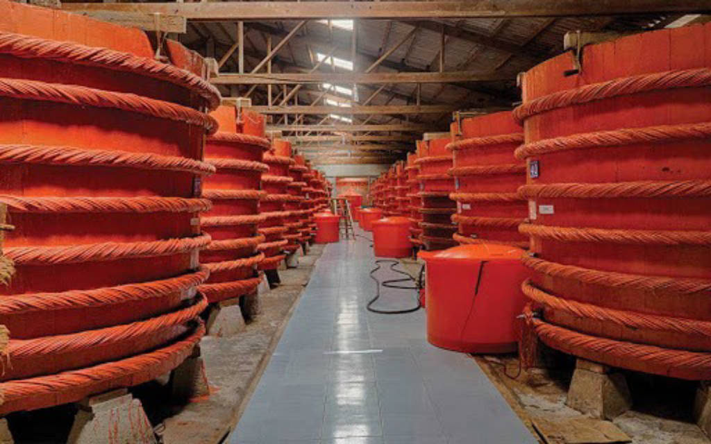 Bên trong nhà thùng là hàng dãy những thùng gỗ màu đỏ cam được xếp liền kề, chúng đang trong các giai đoạn lên men khác nhau, mỗi thùng sẽ chứa khoảng 12 - 14 tấn hỗn hợp cá cơm và muối. Nhiệt độ ở nhà thùng lúc nào cũng ngang với bên ngoài, bởi khí hậu nắng nóng quanh năm của Phú Quốc rất thích hợp để làm nước mắm và điều này sẽ giúp nước mắm được lên men đúng cách.