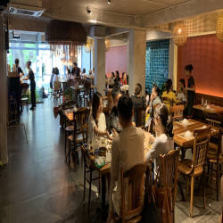 With a design of three floors, each floor gives diners a very strange and new space experience. Entering the ground floor, the pleasant feeling is the first thing diners feel at Khoai Restaurant. Still a simple brick wall, large windows open close to take advantage of the wind and sunlight thoroughly. The wooden tables and chairs are not fussy, neatly arranged, light and delicate. The most prominent feature in the ground floor space is the white painted wall with the restaurant logo at the end of the room. And this is the creative point of Khoai Restaurant, because just by shining the colored light on the wall, a shimmering space welcomes you into the endless seafood party. In addition, when coming to Khoai Restaurant, diners can also choose other unique corners depending on their preferences. Is a large dining table space for important parties, large gatherings. Or small, cozy corners to make the love story more private, to get closer to each other more warm. It is the diversity in design, sophistication when pampering the psychology and preferences of diners that make Khoai Le Quy Don Restaurant become lovely in the hearts of Saigon diners. And if you are a lover of nature, plants and flowers, Khoai Restaurant will also give you an airy, extremely cool green space. With an open space, taking full advantage of the wind, you will be able to dine in a fresh and cool space, listening to every drop of sunshine dancing on the foliage, echoing the sound of birds passing branches.