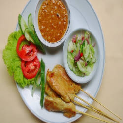 Satay là một trong những món ăn đường phố tiện lợi nhất ở Thái Lan. Nó bao gồm thịt gà, thịt bò hoặc thịt lợn thái mỏng hoặc thái hạt lựu đâm vào từng xiên và nướng với gia vị cay nhẹ. Bạn cũng có thể tìm thấy món satay chay làm từ đậu phụ. Nó thường được phục vụ chung với nước sốt đậu phộng, đôi khi là với salad trộn giấm.
