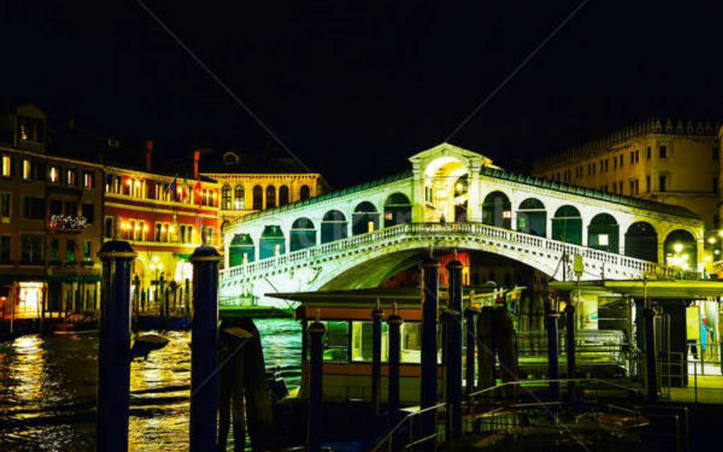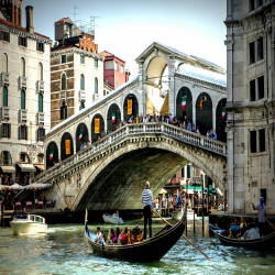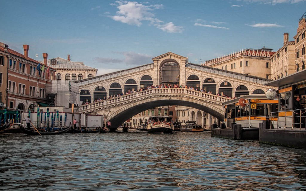 - Cầu Rialto bằng đá 500 năm tuổi, được đóng gói với các cửa hàng ở hai bên. Như vậy, cầu Rialto thế kỷ 16 cho đến nay là cây cầu Grand Canal lâu đời nhất và phân chia các quận San Marco và San Polo.