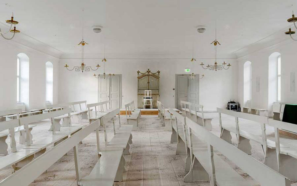 Trung tâm của Christiansfeld là Nhà thờ Brødremenigheden – nhà thờ duy nhất của Hội Anh Em Moravian tại Đan Mạch. Với thiết kế đơn giản nhưng ấn tượng, hội trường không có cột chống và có thể chứa tới 1.000 người. Nội thất trắng tinh khôi, sàn rắc cát và những chiếc đèn chùm rèn tay từ năm 1777 tạo nên một không gian thanh bình và trang nghiêm.