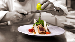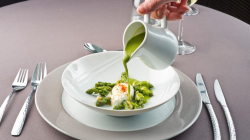 Phi lê cá, trộn thì là với hạt hồi, khoai tây nghiền, nước xốt bouillabaisse jus gà guinea Pháp hảo hạng, Polenta kem với húng quế, hành tây, caramen, sốt chua ngọt