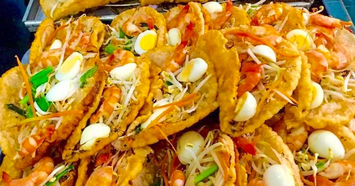 Đầu tiên chúng ta sẽ nếm thử Đặc sản Huế - Bánh Khoai – Bánh xèo Huế. Người ta cho rằng đây là “chiếc bánh hạnh phúc” vì nó giống một nụ cười thật tươi khi được gấp lại giống như chiếc “Taco”.