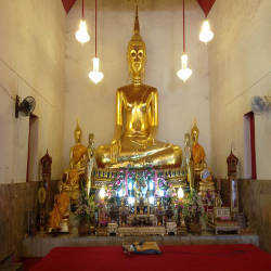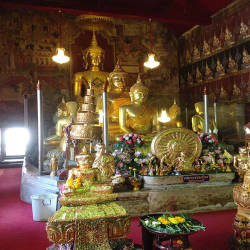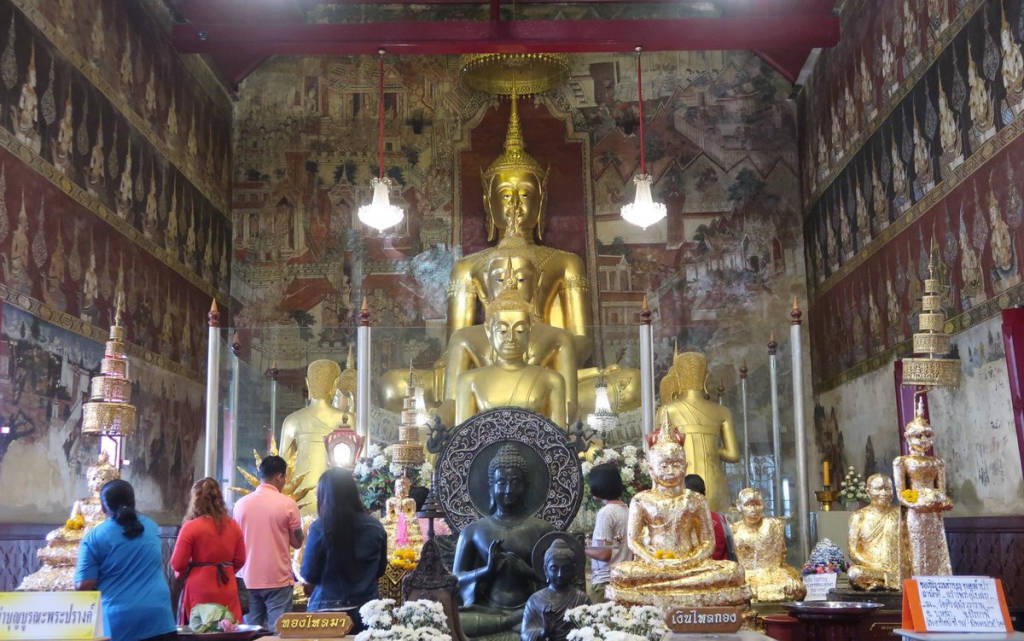 At the back of the viharn are three large images of Buddha in front of each other surrounded by several smaller images of important devotees and monks. The main Buddha statue was cast in the Ayutthaya period. The ornate pedestal supports the images carried by warriors and mythical creatures. A large Dharma wheel covered with gold leaf represents Buddhist teachings.