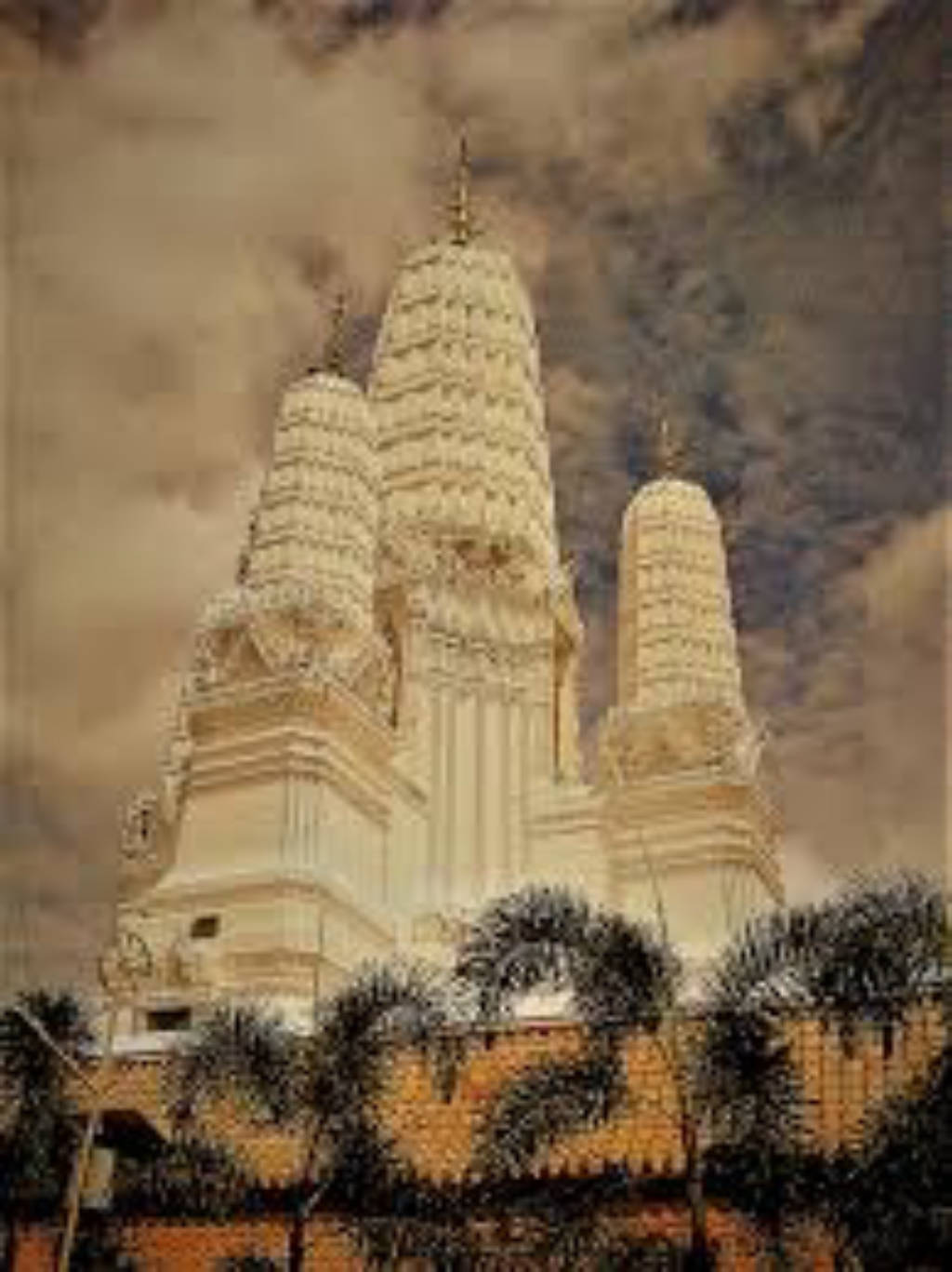 Surrounded by four smaller pagodas, the tallest central tower, rising over 40 meters, houses Buddha's relics. Adorned in large niches on all four sides of it are standing golden Buddha images. The prangs are plastered with bricks, decorated with fine stucco work, topped by a three-pointed spear, a weapon of the Hindu god Shiva. Covering them was a small multi-tiered ceremonial umbrella.