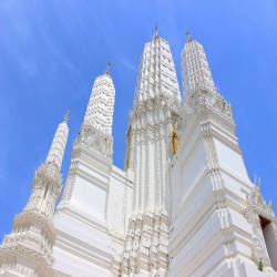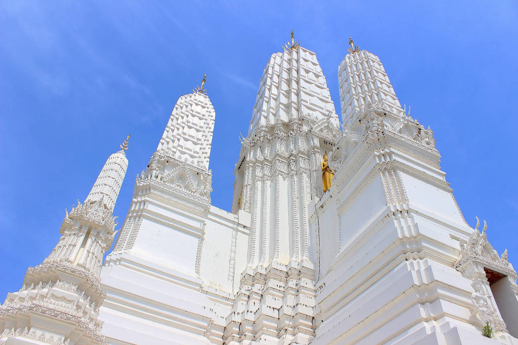 The large complex is surrounded by a wall with several elaborate grand entrance gates. Wat Mahathat Worawihan consists of five large prangs, a viharn, a ubosot, several stupas, kuti and several other monastic buildings. Most eye-catching are the five white shrimps towering over the area, visible from much of Phetchaburi town. The temple is also known for its many fine stucco works.