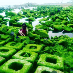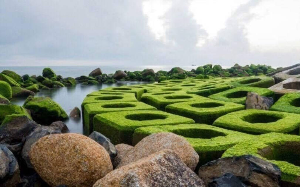 – Khi thuỷ triều rút xuống và bình minh vừa ló dạng (vào khoảng thời gian 5 – 6h sáng). màu xanh của rêu cộng hưởng với ánh nắng vàng buổi sớm mai tạo nên một bức tranh vô cùng bắt mắt, tươi mới, tràn đầy sức sống.