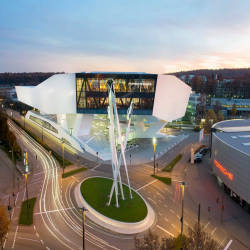 Chỉ được hỗ trợ trên ba cột hình chữ V, cấu trúc chính chủ đạo của bảo tàng dường như nổi trên mặt đất như một khối đá nguyên khối. Kiến trúc táo bạo và năng động này phản ánh triết lý của công ty. Nó được thiết kế để truyền đạt cảm giác tiếp đón và dễ gần để chào đón du khách một cách thân thiện.