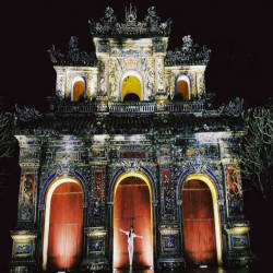 Surrounded by a system of citadels preserving the architectural quintessence of the East and the West. The Imperial Citadel has a nearly square ground, built of bricks, 4m high, 1m thick, surrounded by a protective moat, has 4 main entrances: Ngo Mon (main door) is located in the South, Hien Nhon Gate is located in the East. , Chuong Duc Gate is located in the West, Hoa Binh Gate is located in the North. The bridges and lakes dug around the outside of the citadel are named Kim Thuy.