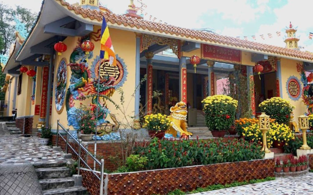 The main hall of Sung Hung Pagoda is elaborately and carefully decorated, this is the place to worship the three most important deities including Amitabha, Mahasthamaprapta Bodhisattva and Avalokitesvara Bodhisattva. Behind the worshiping statues is a work called "Dragon Flying" by artist Cao Sanh. Walking along the main hall, visitors will come to a sacred place to worship the national hero Nguyen Trung Truc, who devoted his life to fighting the French colonialists and protecting the peaceful lives of local people.