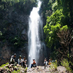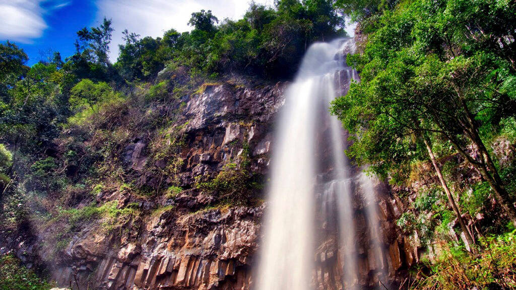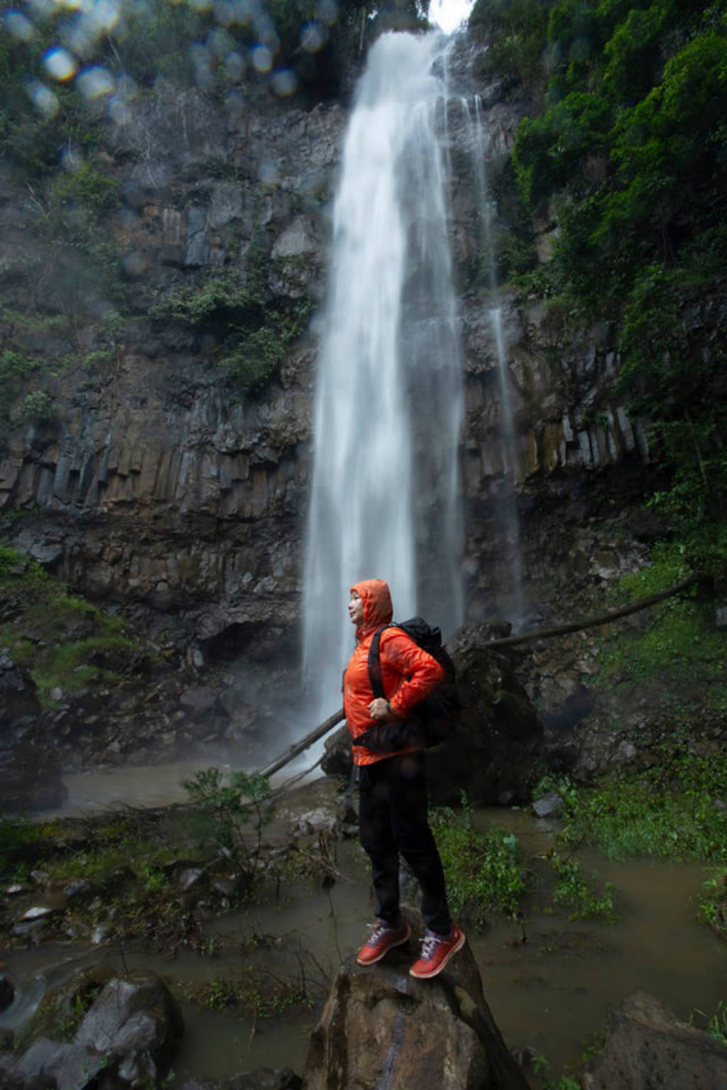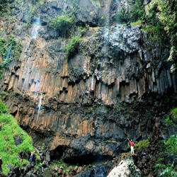 To get to the waterfall, from the center of Pleiku city, visitors along National Highway 19 about 68km will arrive at the intersection of Truong Son Dong Street, here turn left in the direction of Kon Ka Kinh National Park about 63km. Cheng village, from here, tourists follow the red dirt road to the waterfall. However, the road leading to the waterfall is very slippery and difficult to walk, sometimes visitors have to cling to the bushes on both sides of the road or sometimes have to crawl. However, when listening to the roaring water through each rock crevice when approaching the waterfall, it creates excitement, curiosity and visitors' feet like walking faster to find out what this Dak Bok waterfall will be like. . And then, when passing a carpet of green moss and immense ferns, gradually appearing in front of visitors is a majestic beauty of a waterfall about 80 meters high, crashing down, down the stacked stone roofs. like a painted maiden letting her hair down by a cool stream. At the top of the waterfall, strong water flows down, white foam, cool steam covers the whole area. The waterfall is illuminated by the sun, becomes shimmering silver, bright and glittery, sometimes forming small rainbow pieces, making the scene here even more fanciful and magical. The area around the waterfall has cylindrical basalt blocks that are aligned like a pre-arranged arrangement. These cylindrical rapids are geological features that were formed millions of years ago. The square cylindrical rocks standing straight under the waterfall create an incredible beauty of nature.