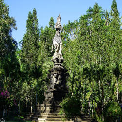 Tirta Empul temple complex consists of 3 main subdivisions: front yard, side yard and inner courtyard. Visitors to Tirta Empul will find lush gardens and paths decorated with statues and tropical plants leading to the entrance. After entering through the large stone Bali gate (locally called Candi Bentar), visitors will enter the temple's outer courtyard. This area is called “Jaba Pura”. At the end of the courtyard is another Candi Bentar gate built into the wall that leads to the central courtyard. This gate is guarded by elaborately carved giant statues of two Dwarapala (guardians) covered in golden color. On the top of the gate is a Kala carving which is quite different from other Kala carvings as it has protruding fangs and an extended pair of hands.