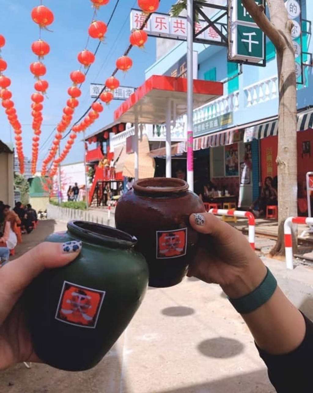 Một điều rất thú vị khác ở hẻm Hồng Kông là hầu hết thức uống đều được đựng trong một cái chum nhỏ xinh y như phim kiếm hiệp. Và nội thất cũng như phong cách thiết kế của các quán tại hẻm cũng đồng nhất với bên ngoài. Những chiếc bàn bằng gỗ, những bức tường màu đỏ hay những dòng chữ tiếng Hoa nổi bật cùng với những ánh đèn lồng lung linh, huyền ảo,… tất cả tạo nên một không gian mang đậm chất Hong Kong hoài cổ.