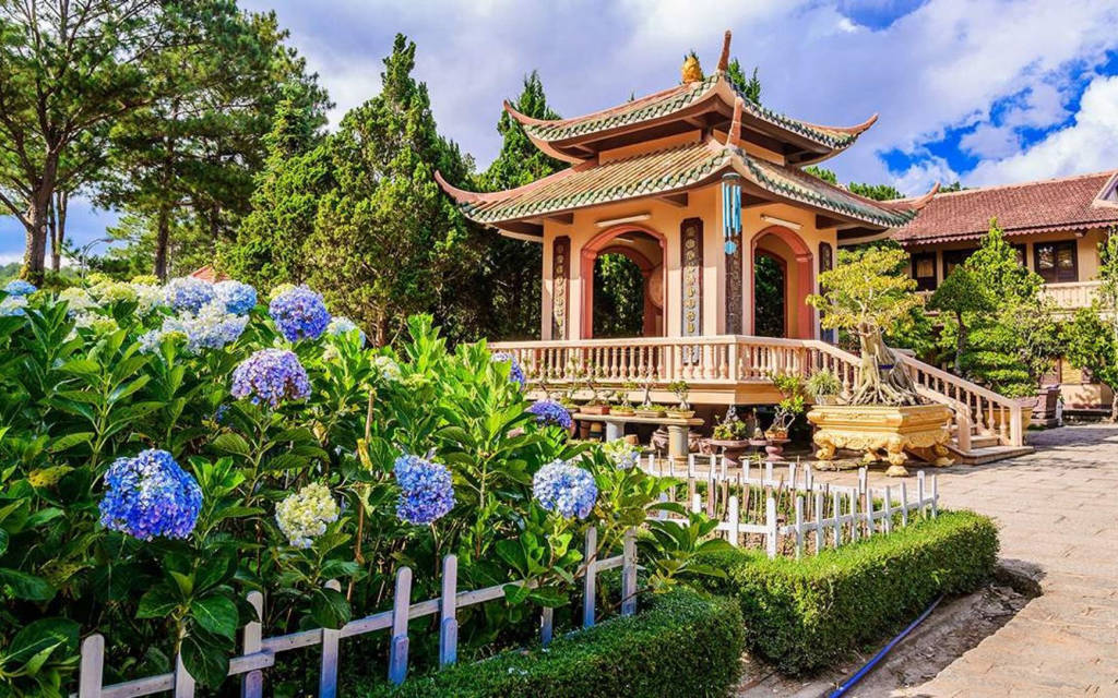 Khu vườn quanh thiền viện được chăm sóc tỉ mỉ, trồng nhiều loại hoa đặc trưng của Đà Lạt như cẩm tú cầu, mai anh đào, đỗ quyên và các loại bonsai cổ thụ. Những con đường lát đá, được bao bọc bởi sắc xanh của cây cối và tiếng chim hót líu lo, mang lại cảm giác bình yên và gần gũi với thiên nhiên.