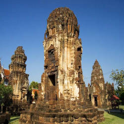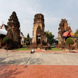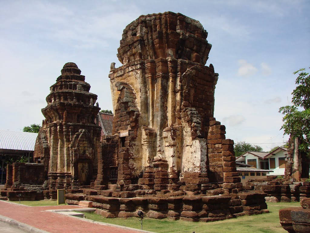Originally, the temple had five laterite prangs. The largest prang stands in the center surrounded by four smaller prangs in the corners. Today four remain, one has collapsed. The top of the prangs is a classic cob shape, tapering towards the top. All structures are completely covered with mortar. Some intricate stucco decoration in floral motifs remains to this day. A few of the nooks and crannies in the prangs museum have been badly damaged and the images of the Buddha are weathered. The main tower, the South tower and the North tower stand on a high base. Each prang holds an image of an idol like Shiva and Vishnu, Hindu gods worshiped by the ancient Khmers.