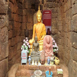 The temple consists of five Bayon-style prangs and a small chapel, which was a later addition. During excavations by the Department of Fine Arts of Thailand in 1987, several images were found, including Nak Prok (Buddha sitting on Mucalinda snake body and covered by its hood) and images of Lokeshvara, the Bodhisattva of compassion.