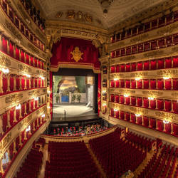 The visit includes exploring the theater's grand foyer, an elegant and sparsely decorated hall. You will then be taken to small red satin-upholstered chairs, where the high society enjoyed and still enjoys the various operas and ballets performed at La Scala.