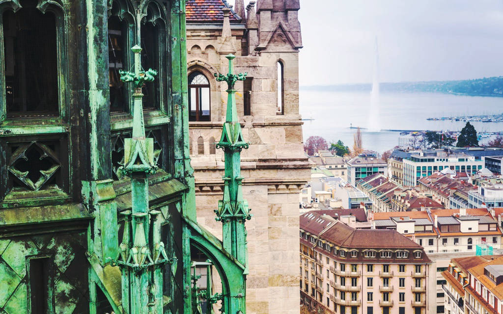 Lên đến đỉnh cầu thang là phía sau Nhà thờ Saint Pierre (Saint Pierre Cathedral), được xây dựng theo lệnh của Hoàng tử Giám mục của Gevena, Arducius de Faucigny vào năm 1160. Kiến trúc của Nhà thờ Saint Pierre đã trải qua nhiều thay đổi lịch sử của nó. Giai đoạn xây dựng đầu tiên của nó bắt đầu từ năm 1160 và kéo dài gần một thế kỷ. Dưới thời Cải cách, nó trở thành nơi thờ cúng của đạo Tin lành từ năm 1535.