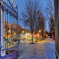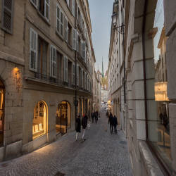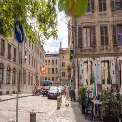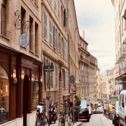 Đi bộ dọc theo con đường phía sau Temple de la Madeleine và bên trái từ hầm tránh bom là khu phố Rue Perron xinh đẹp, trước đây từng là đường huyết mạch giữa các con đường thấp hơn và Hôtel de Ville và Nhà thờ St. Pierre trong khu phố cổ. Ngày nay, đây là nơi có cấu trúc chiếu sáng công cộng cuối cùng, nằm trên góc của một toà nhà bằng đá, có từ thế kỷ 16. Khi ánh sáng công cộng lần đầu tiên được bắt đầu trong thành phố, nó nỗ lực làm cho đường phố an toàn hơn sau khi trời tối.