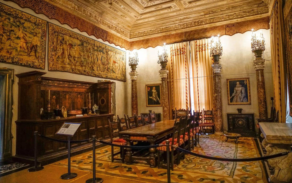 Khu vực tầng trệt và vườn được trang trí với những đài phun nước kiểu Ý và Pháp, hồ bơi và tượng tuyệt đẹp.
