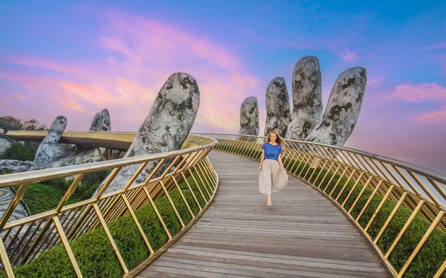 Khám phá Bà Nà Hills với Cầu Vàng nổi tiếng với đôi bàn tay khổng lồ, khu làng Pháp cổ kính và hệ thống cáp treo đạt 4 kỷ lục thế giới. Đắm mình vào cảnh quan thiên nhiên hùng vĩ, thưởng thức tiệc buffet đa dạng, chiêm ngưỡng kiến trúc độc đáo và không gian linh thiêng tại Chùa Linh Ứng. Trải nghiệm các trò chơi giải trí thú vị tại Fantasypark - hành trình giao thoa văn hóa và cảm xúc!