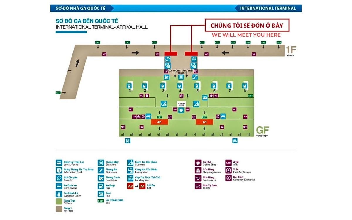 • Đón khách trước giờ khởi hành 2 tiếng tại bảng thông tin điện tử (kế quầy H) ga đi quốc tế.