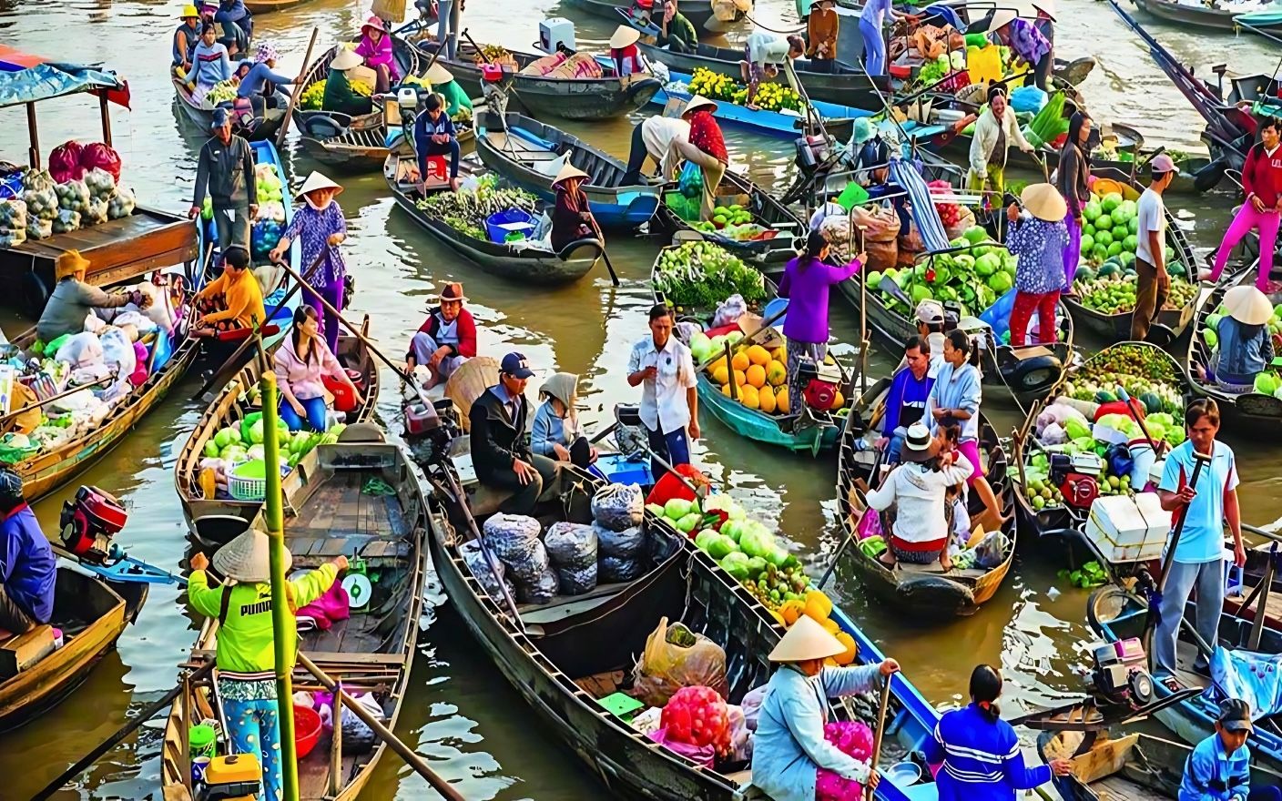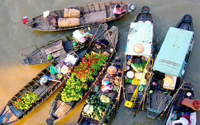 Sau khi đến Cái Bè, chúng ta sẽ lên tàu để khám phá thảm thực vật tươi tốt của Đồng bằng sông Cửu Long và chợ nổi nhộn nhịp.