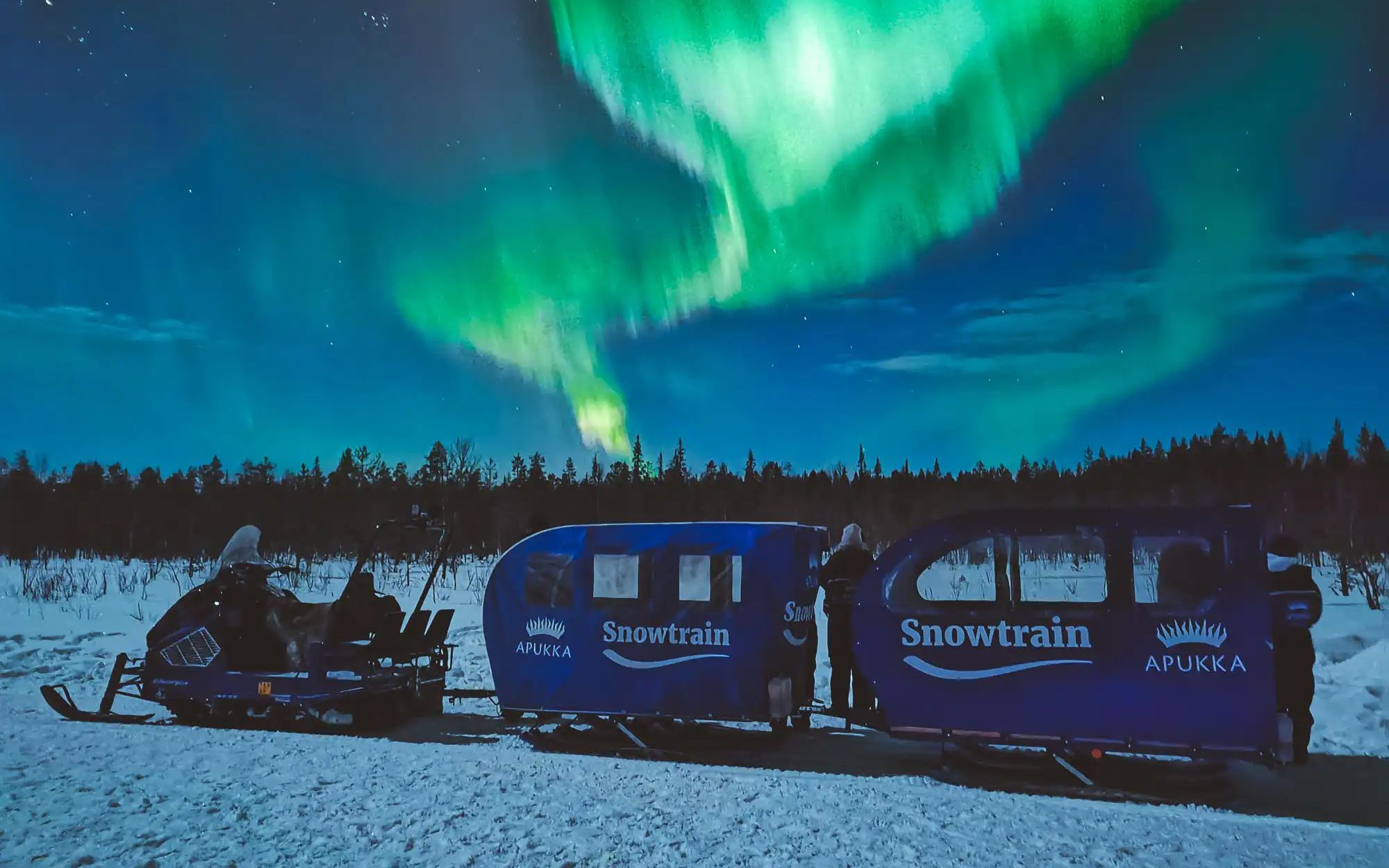 Hãy đến xứ sở thần tiên mùa đông trên toa xe ấm áp của tàu trượt tuyết nổi tiếng của chúng tôi! Trong chuyến đi này, bạn sẽ rời xa ánh sáng nhân tạo để tìm kiếm Bắc Cực Quang. Sau chuyến đi, bạn sẽ quây quần bên đống lửa trong kota Lappish truyền thống, một túp lều nằm sâu trong vùng hoang dã. Thưởng thức đồ ăn nhẹ và đồ uống nóng trong khi nghe những câu chuyện về Bắc Cực Quang. Chuyến tham quan này hoàn toàn tập trung vào Bắc cực quang, nhưng bạn cũng được trải nghiệm vẻ đẹp của khu rừng nguyên sơ, đầy tuyết, bóng tối và sự yên tĩnh. Vì Bắc cực quang là một hiện tượng tự nhiên nên không ai có thể đảm bảo 100% sẽ nhìn thấy chúng, nhưng chuyến đi này mang đến một cơ hội tuyệt vời!