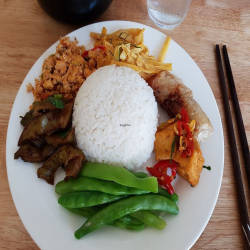 Nhà hàng phục vụ một thực đơn thuần chay theo kiểu Việt Nam và phương Tây kết hợp. Bạn có thể gọi các món ăn được chế biến từ đậu hũ, salad trái cây, chả giò, khoai tây chiên, sinh tố và sữa lắc thuần chay. Nhà hàng nằm cạnh khu du lịch Tam Cốc nên khá đông khác và bạn cần đặt chỗ trước nếu đến đây vào mùa du lịch hoặc các ngày cuối tuần để được phục vụ tốt hơn.