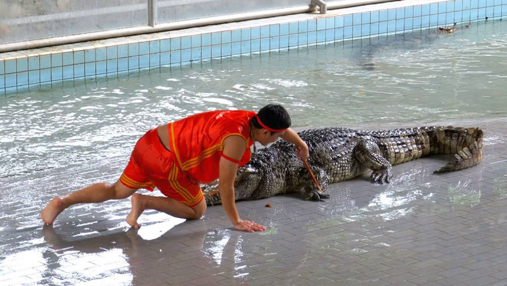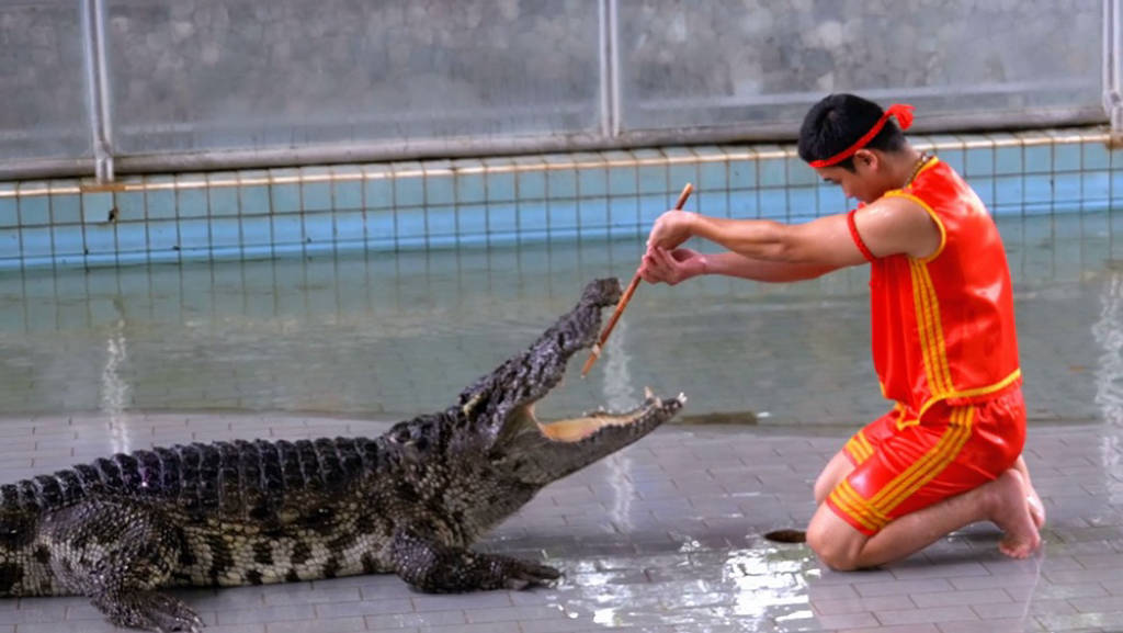 Những người biểu diễn đến gần cá sâu và thực hiện một loạt các tư thế khó khăn. Từ hôn lên mũi cá sấu đến đưa cả cánh tay và thậm chí cả đầu vào miệng chúng. Màn biểu diễn sẽ có bạn ở rìa chỗ ngồi của mình.
