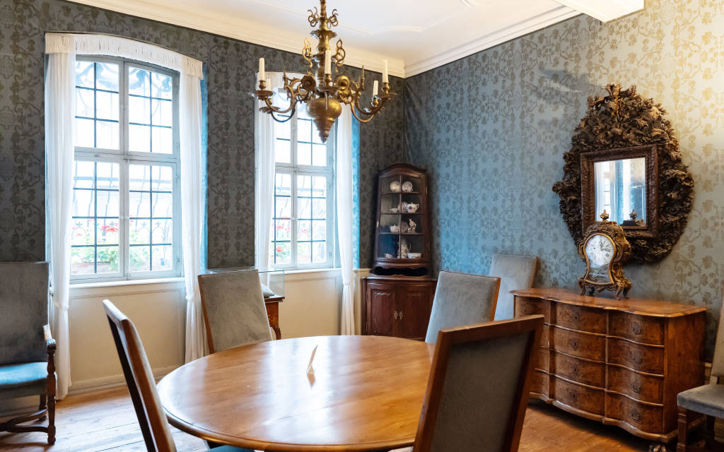 Bước vào tầng trệt, du khách sẽ thấy phòng bếp được tái dựng theo phong cách thế kỷ 18, gợi lại đời sống ẩm thực giản dị của một gia đình trung lưu. Phòng ăn liền kề là nơi diễn ra các bữa cơm chung và cũng là trung tâm sinh hoạt hằng ngày của gia đình Goethe. Tại đây, người tham quan có thể cảm nhận nhịp sống xưa qua từng vật dụng gia đình được bày biện.