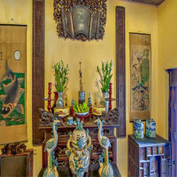 • Phòng thờ: Một khu vực linh thiêng, trang trọng, nơi gia đình tưởng nhớ tổ tiên. Trên bàn thờ luôn có đôi hạc đồng, đỉnh đồng và bát nhang cổ.