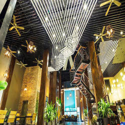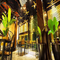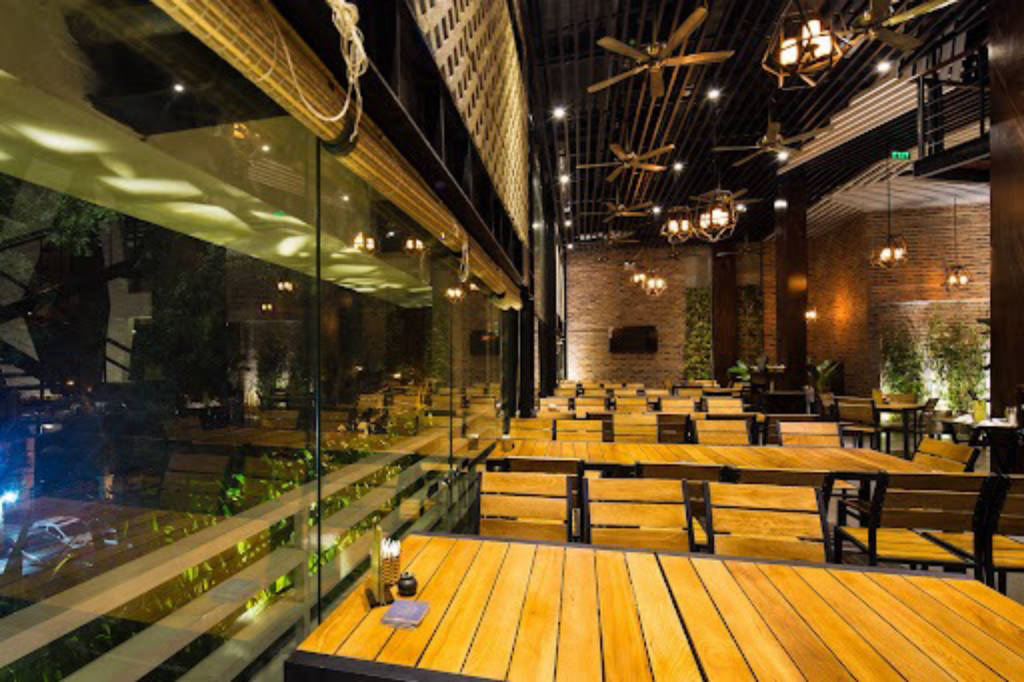 Located on a large space with an area of about 1,800m2 with 3 floors, each floor has a height of 7m, designed with a statue design, bold 3-dimensional space style to create a sense of ventilation. The restaurant uses trees to decorate the facade as well as the interior space to create a feeling of freshness and closeness to nature. This is a big difference of Porcelain Beer compared to other beer restaurants that are used to using closed spaces and using air conditioning. The restaurant is designed with stairs around the grass, wooden bends and reinforcement connecting the floors together. With a capacity of 700 guests, the restaurant is an ideal place to organize company parties, year-end parties, hop meetings, birthdays or simply a meeting with friends or a cozy family meal. .