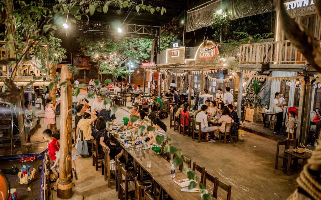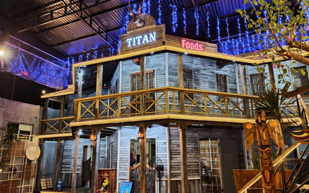 Nhà hàng được trang trí độc đáo theo cảm hứng phong cách hoang dã của cao bồi miền Tây nước Mỹ. Những cột gỗ chạm trổ họa tiết về miền Tây viễn chinh của những chàng cao bồi da đỏ, những mảng gỗ ốp đầy phong cách là tăng thêm bầu không khí thoải mái, vui vẻ ở Titan Town Pub này