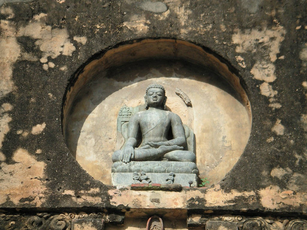 Ngôi đền cao 55 mét, Shikhara (tháp) hình kim tự tháp của nó bao gồm một số lớp hốc, họa tiết vòm và chạm khắc tinh xảo hình Đức Phật, hình Bồ-tát, các thần linh theo truyền thống Đại thừa. Cấu trúc nổi bật là vòm tháp giống như chiếc ô, trên nền tháp chính có các tháp nhỏ ở 4 góc, mỗi tòa tháp giống hệt với tháp trung tâm của nó. Một điện thờ bên trong ngôi đền có một bức tượng Phật bằng đá sa thạch màu vàng được bọc trong kính. Tượng Phật cao 2m, đặt trên một bệ đá cao 6m, với nét mặt Phật rất thanh thản, có một ngón tay chỉ xuống đất, mặt tượng hướng về phía Đông.
